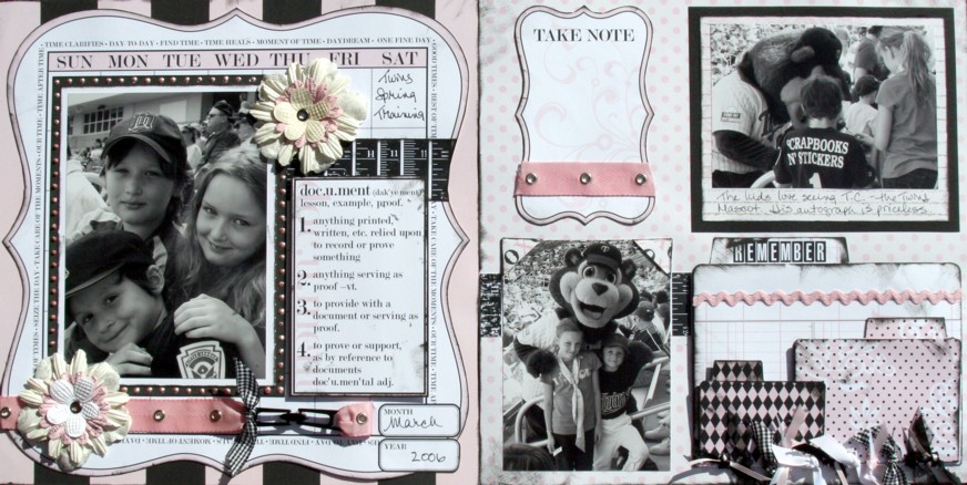 A Taste of Scraptique Part Deux is the name of one of our classes that we will be teaching at the National Conventions all year for 2009. This is the first layout that we will teach. It is based around papers by Teresa Collins Designs and features lots of layering, embellishing, Prima flowers and more. The file folder flip file on the lower right hand actually has three files that are layered for photos and more journaling. I love the way it turned out! Attendees need to bring an eyelet setter for this layout, black distress inks and a paper piercer. The ribbons at the bottom of the file folder are tied through punches made with the Bind-It-All machine which we will have in class for you to use.